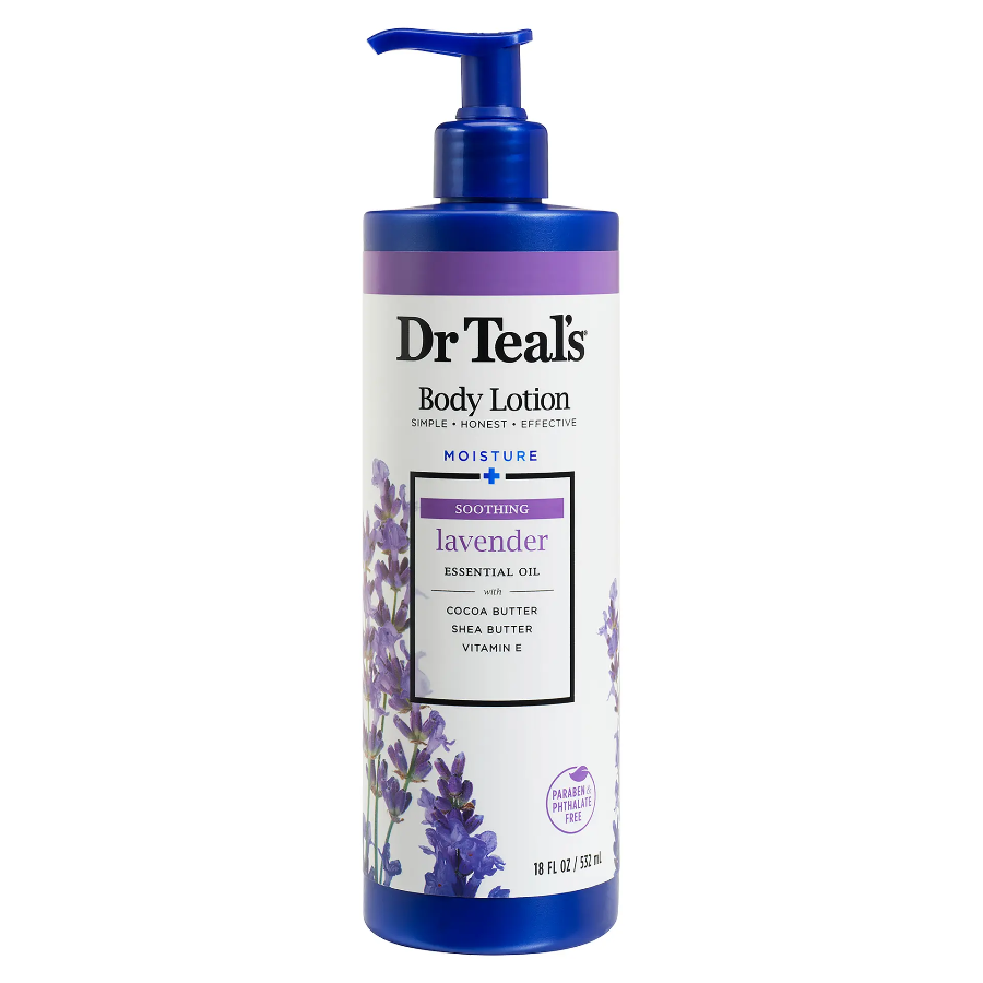 Dr Teal's Body Lotion with Lavender Essential Oil is a soothing moisturizer enriched with cocoa butter, shea butter, and vitamin E. This paraben and phthalate-free formula provides effective hydration while the calming lavender scent helps promote relaxation. Key features: • Contains soothing lavender essential oil • Enriched with cocoa butter and shea butter • Includes vitamin E for skin nourishment • Paraben and phthalate free formula • Simple and effective moisturizing • Comes in a convenient pump bottle The 532ml body lotion features a blend of natural ingredients known for their moisturizing properties. The combination of cocoa butter and shea butter helps nourish and soften skin, while vitamin E provides antioxidant benefits. The lavender essential oil adds a calming aromatherapy element to your skincare routine. The product comes in a practical pump dispenser bottle with an elegant design featuring lavender florals.