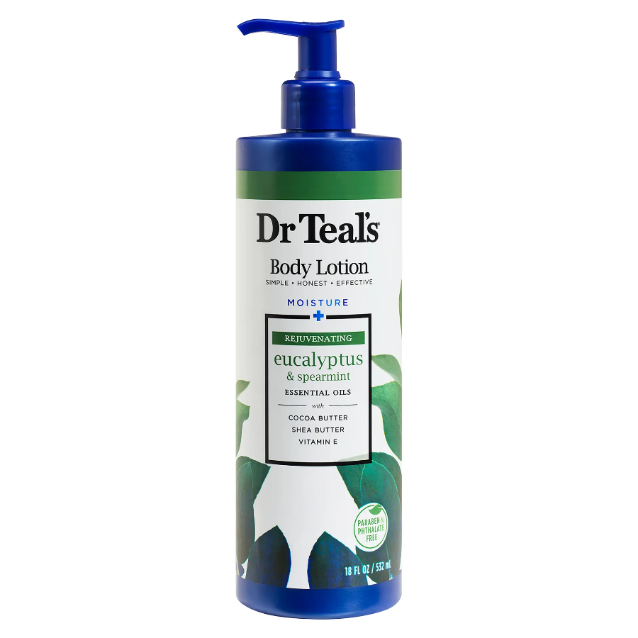 Dr Teal's Body Lotion combines rejuvenating eucalyptus and spearmint essential oils with nourishing ingredients like cocoa butter, shea butter, and vitamin E. This moisture-rich formula provides effective hydration while delivering an invigorating scent experience. Key features: • Contains eucalyptus and spearmint essential oils • Enriched with cocoa butter and shea butter • Includes vitamin E for skin nourishment • Paraben and phthalate free formula • Comes in a convenient pump bottle • Large 532ml size • Simple, honest and effective moisturization This body lotion is part of Dr Teal's rejuvenating eucalyptus and spearmint collection. The combination of essential oils provides an uplifting and refreshing aromatherapy experience while moisturizing the skin. The formula is designed to be easily absorbed while providing lasting hydration. The product comes in a blue bottle with a pump dispenser for convenient application.