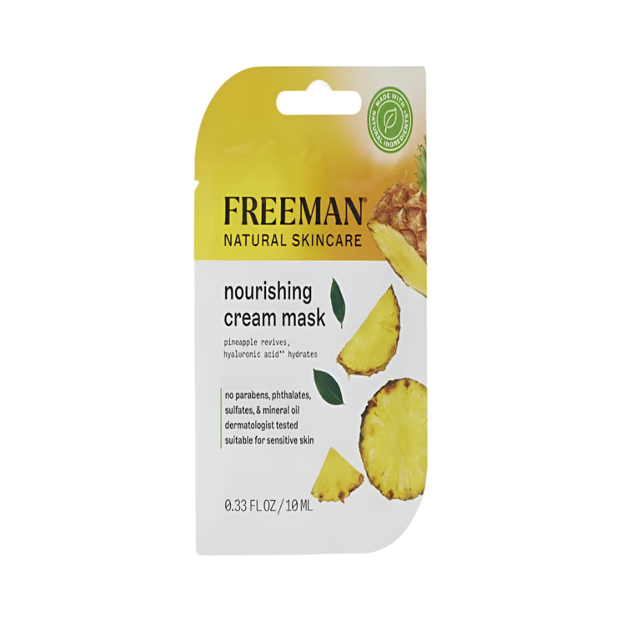 Naturally derived simple skincare. Freeman Natural Skincare Nourishing Pineapple & Hyaluronic Acid Cream Facial Mask is infused with pineapple and hyaluronic acid, which helps to moisturize and plump skin for a naturally dewy glow. The Vitamin C in pineapple acts as a gentle natural exfoliant and helps to treat acne, sun damage, and uneven skin tone. Hyaluronic acid alleviates dry skin and reduces the appearance of fine lines. All formulas are made with natural ingredients. Our Naturals Collection was created to bring natural ingredient benefits into skincare solutions with the nasties. We know clean beauty can be confusing. Our goal is to keep our skincare simple. Clear, inclusive, and accessible for the everyday consumer. The same good-for-you ingredients used in your diet also make a huge difference in your skin. Easy to pronounce and provide the most natural benefits.